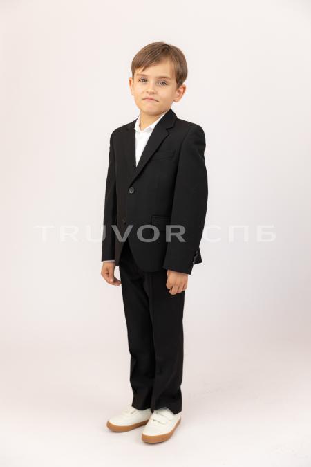Костюм для мальчика чёрного цвета, застёжка на две пуговицы, две шлицы, боковые карманы с клапаном, хорошо подходит для ежедневной носки. В состав этой ткани входят: 1) вискоза - позволяет этой ткани дышать, а обладателю изделия чувствовать себя более комфортно, 2) полиэстер - придаёт этой ткани повышенную износостойкость.